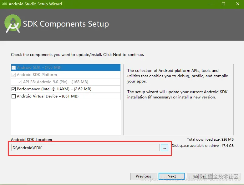 继续Next,到达定制组件页面,如下图设置一下SDK的安装路径,比如我的是D:\Android\SDK