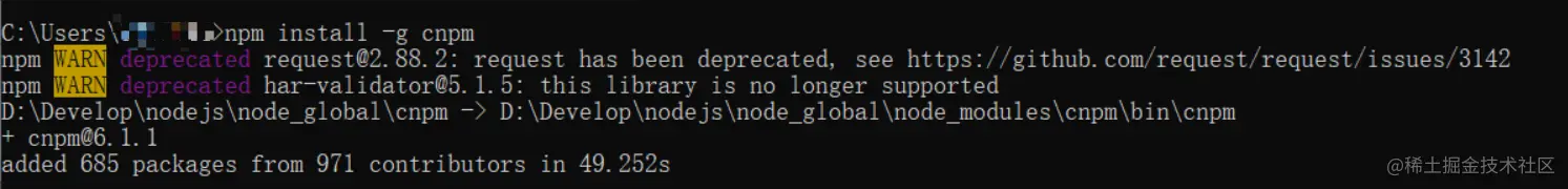 没有cnpm包,需要先安装cnpm:命令行输入:npm install -g cnpm,出现下图为安装成功