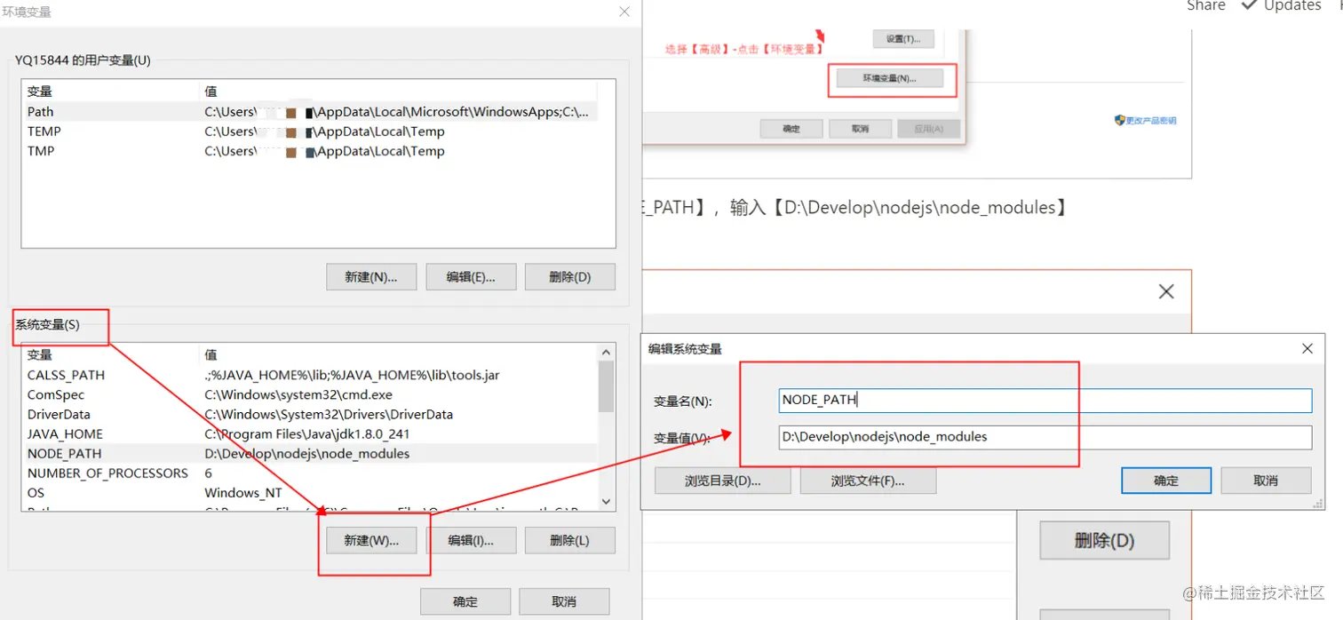 在【系统变量】下新建【NODE_PATH】,输入【D:\Develop\nodejs\node_modules】