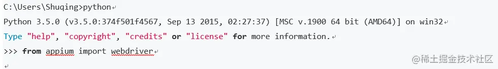 输入命令“python”—>“from appium import webdriver” 回车,如果控制台没有报错,则说明安装成功