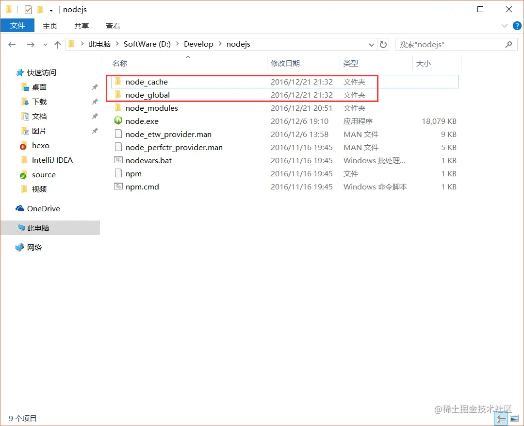 2、将全模块所在路径和缓存路径放在我node.js安装的文件夹中,在node.js文件夹中创建两个空文件夹:【node_global】、【node_cache】,如下图:
