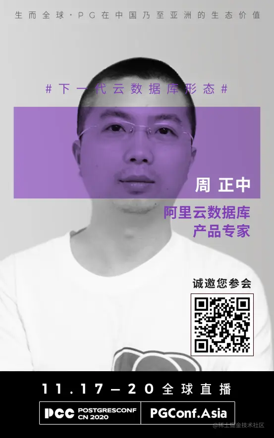 2020 PostgreSQL亚洲大会组委会特别推出嘉宾系列专访,本期我们邀请到了阿里云数据库产品专家德哥(周正中)。他将在11月20日主论坛频道15:30-16:10时间段带来《下一代云数据库形态:MyBase专属集群》分享。