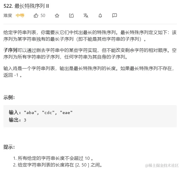 (2)从最开始(长度最长的)字符串枚举到这个字符串之前的字符串(也就是枚举所有长度比当前字符串大的字符串),判断当前这个字符串是不是其他字符串的子序列,如果是,则它不是特殊序列;如果不是,则当前这个字符串的长度就是最长特殊序列的长度。