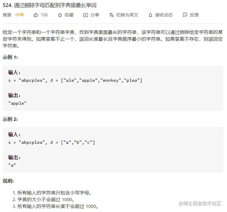 思路也和522题类似,都是对字符串数组按照长度从大到小排序,枚举的时候也是按照字符串长度从大到小枚举,只不过这题里我们要找到最长的,属于字符串s子序列的字符串。 判断某个字符串是否是另一个字符串的子序列的方法和522题完全相同。