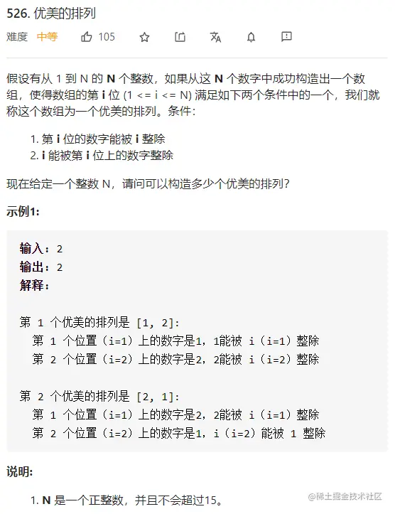 不过这里要剪枝一下,不需要枚举出所有的排列之后逐个判断,对于某个排列的某一位u,如果已经不满足条件了,即不满足u % i == 0 或者 i % u == 0,那么就无需枚举剩下的位。