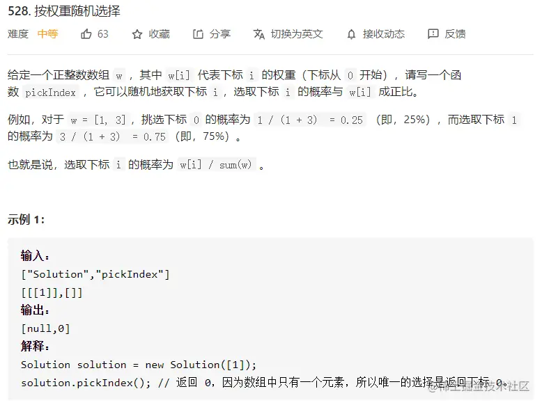 要按照概率随机选择一个数,可以将数组的值看作一个区间上的长度,比如题目给的例子,当w = [1, 3]时,我们可以假设有一个一维的区间,区间前1/4是第0个数,区间的后3/4是第1个数。
