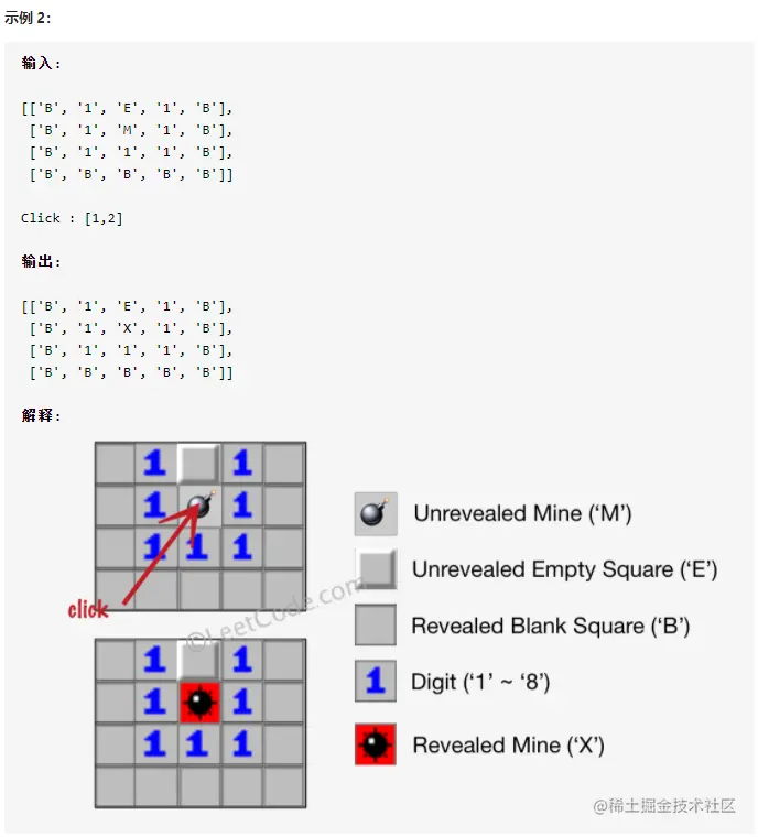直接按照题意进行深度优先搜索,只要当前位置不是地雷,且周围还存在方块可以揭露(搜索)时,就继续搜索,否则停止搜索,返回面板(board)。