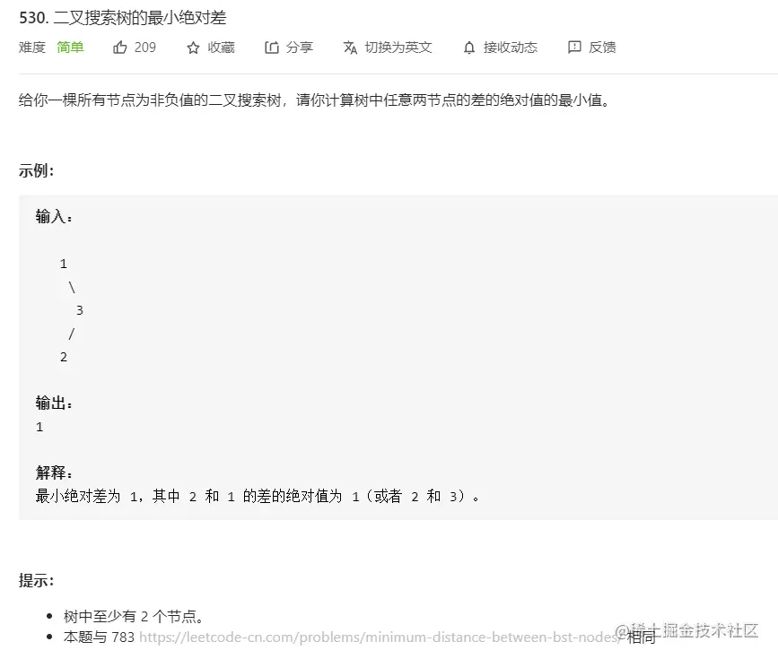 因此可以中序遍历这个二叉搜索树,把结果存在一个数组中,然后遍历这个数组,计算相邻值的最小值,这个最小值就是答案。