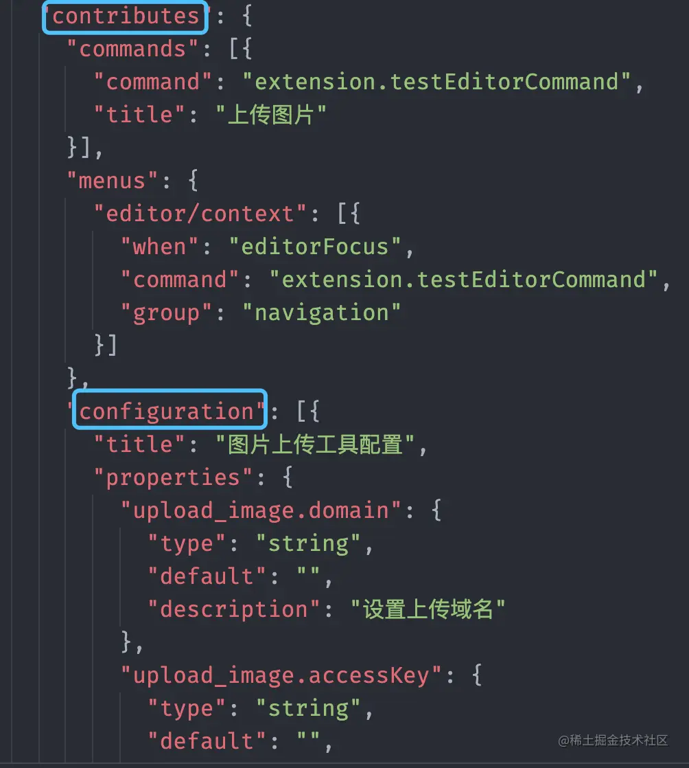在package.json中,可以看到有contributes参数,在这里添加一个configuration来设置插件参数, 如图: