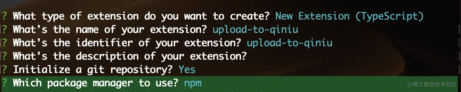 安装成功后,直接对应命令yo code 来生成一个Vscode插件工程 :