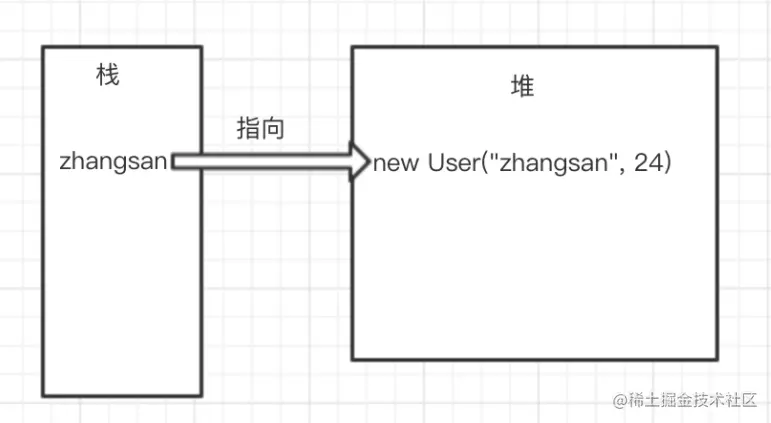 其实zhangsan是栈中分配的一个引用,而new User(“zhangsan”, 24)是在堆中分配的一个对象。而’='的作用是用来将引用指向堆中的对象的。就像你叫张三但张三是个名字而已并不是一个实际的人,他只是指向的你。