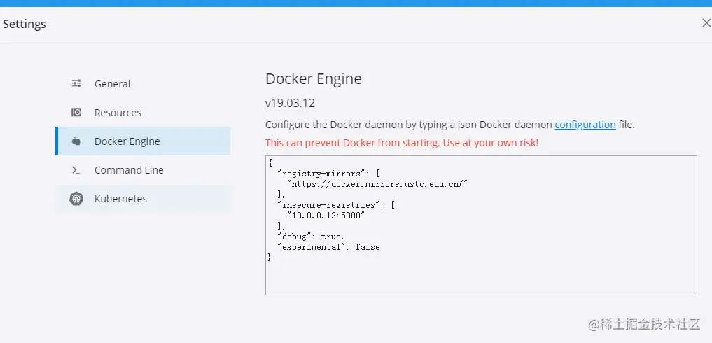 - 点击docker图标,点击邮件看到setting,setting界面上点击docker engine,配置如图所示