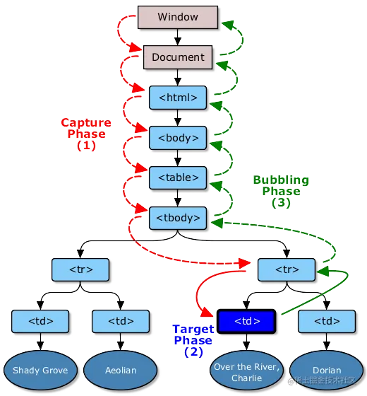ps:而如果是事件捕获,顺序会不同,window->document->html->body->div,事件捕获思想是不太具体的节点更应该接收到事件,具体的节点在最后接收到事件。事件捕获的用意,在事件预定目标之前就捕获它