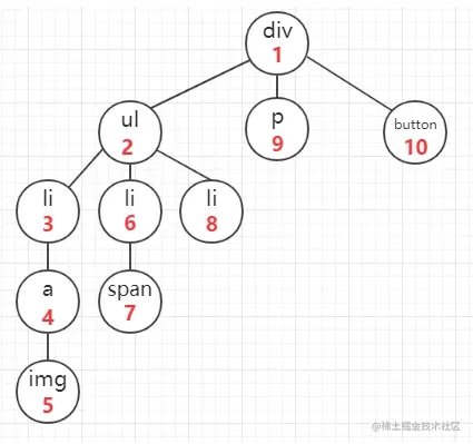 深度优先:该方法是以纵向的维度对dom树进行遍历,从一个dom节点开始,一直遍历其子节点,直到它的所有子节点都被遍历完毕之后在遍历它的兄弟节点。