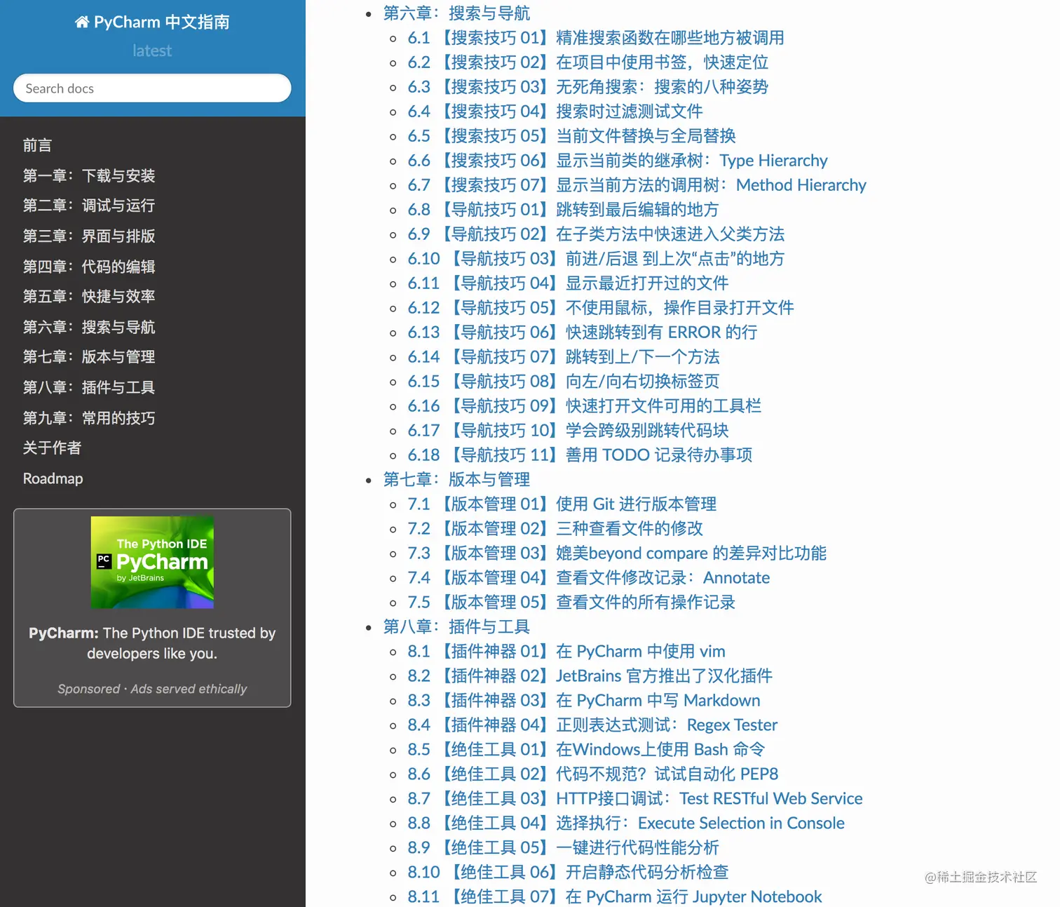 给大家推荐本我自己写的电子书《PyCharm中文指南》,把各种 PyCharm 的高效的使用技巧用GIF动态图的形式展示出来。有兴趣的可以看它的在线文档: pycharm.iswbm.com