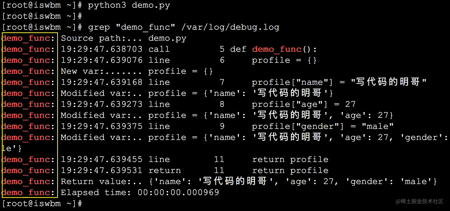 在这种情况下,PySnooper 提供了一个参数,方便你为不同的函数设置不同的标志,方便你在查看日志时进行区分。