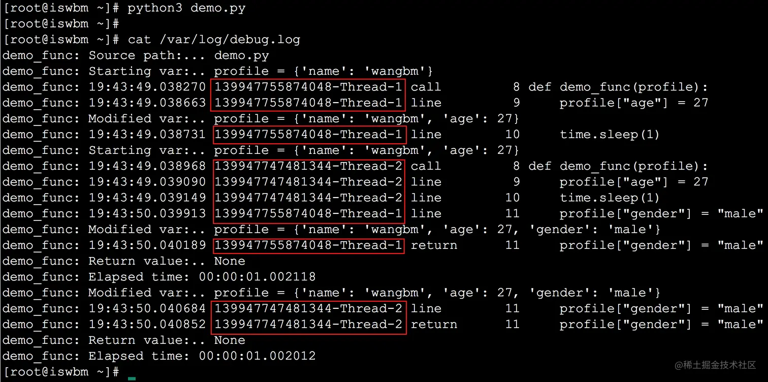 PySnooper 同样支持多线程的调试,通过设置参数 thread_info=True,它就会在日志中打印出是在哪个线程对变量进行的修改。