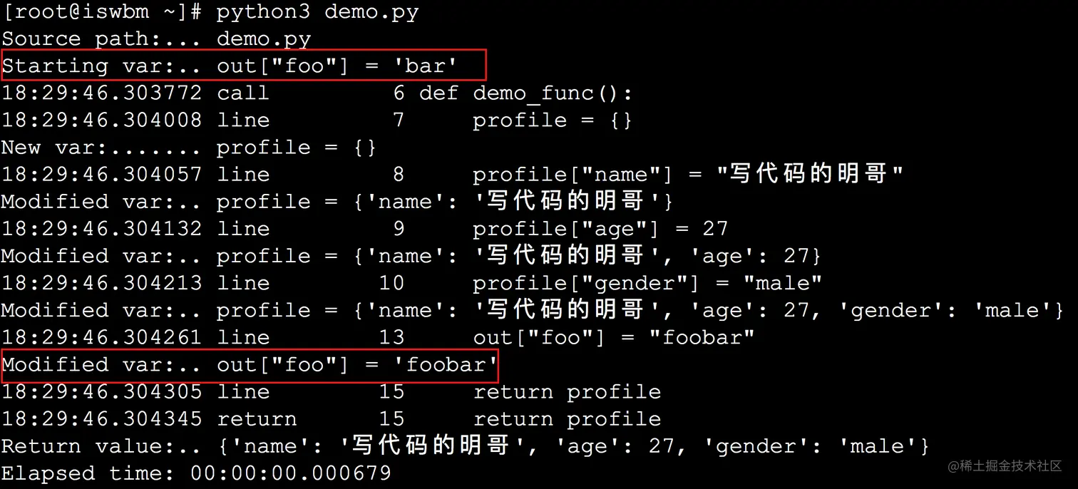 如此一来,PySnooper 会在 out["foo"] 值有变化时,也将其打印出来