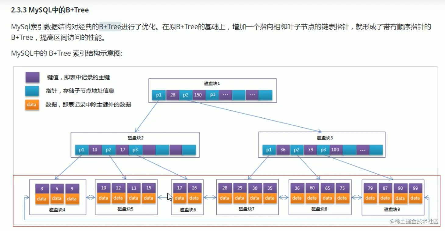 B+树 数据都存放在叶子节点,那么上层的节点,在一次的io中,就可以获取更多的key,减低树的高度,从而减少了io的次数,mysql的B+树,还增加了数据末尾端的指针连接,从而提高了范围查询的效率