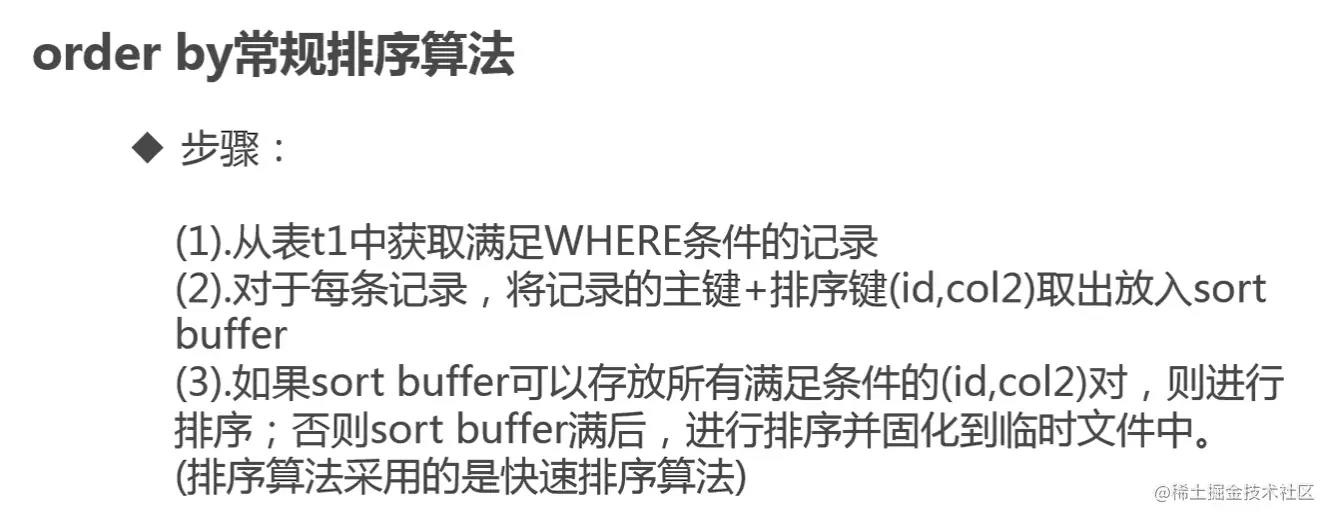 需要经过两步io,分别是将排好序的文件,固化代磁盘(也就是oder by的内容以及id),将磁盘里排好序的内容的主键id去寻找表中对应的数据与排好序的内容合并(如果select出来的字段,没有在固化的文件中,这也叫回表),还需缓冲区的大小默认是256k