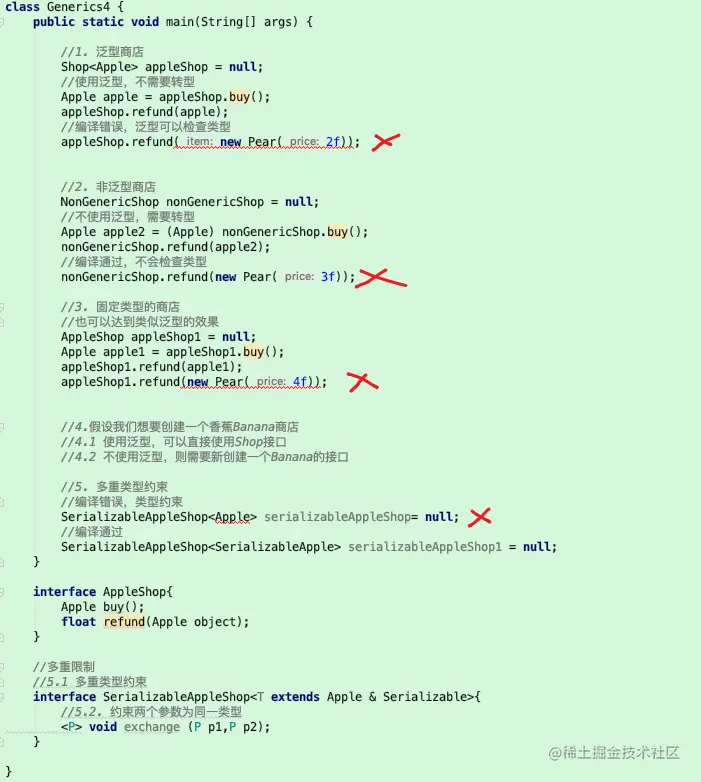 implements Shop<Apple>限制了我们只能购买苹果Apple- 如果我们接口泛型传入的是Pear,那么编译器会提示我们不能这样做