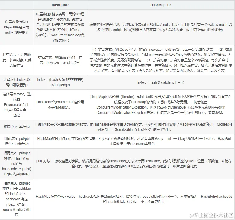 HashTable的key、value都不能为null;TreeMap键、值都不能为null;HashMap的key、value可以为null,不过只能有一个key为null,但可以有多个null的value; -