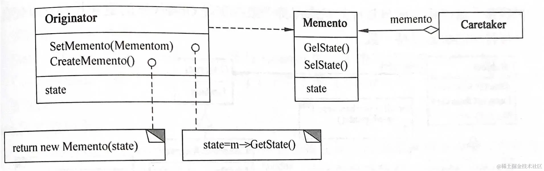 - 在不破坏封装性的前提下捕获一个对象的内部状态,并在对象之外保存这个状态。这样以后就可以将对象恢复到原先保存的状态。