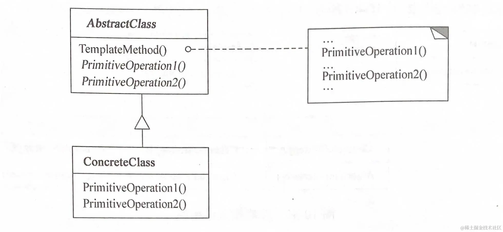 - 定义一个操作中的算法骨架,而将一些步骤延迟到子类中。Template Method 使得子类可以不改变一个算法的结构即可重定义该算法的某些特定步骤。