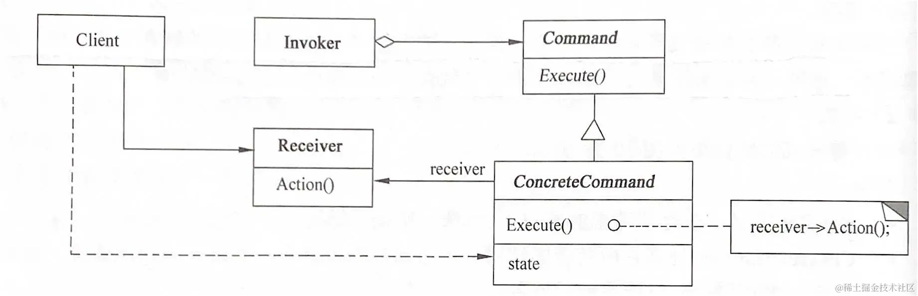 - 将一个请求封装为一个对象,从而使得可以用不同的请求对客户进行参数化:对请求排队或记录请求日志,以及支持可撤销的操作。