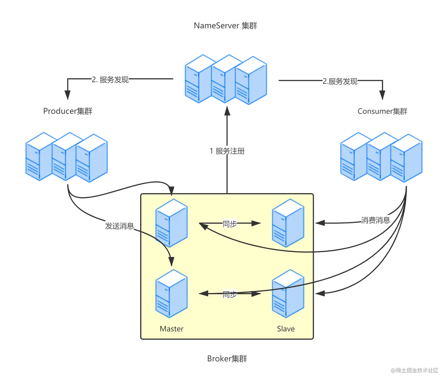 - Name Server是服务发现者,集群中各个角色(producer、broker、consumer等)都需要定时向Name Server上报自己的状态,以便互相发现彼此,超时不上报的话,Name Server会把它从列表中剔除;