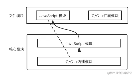 源码编译时已编译进二进制执行文件,在Node进程启动时,部分核心代码被直接加载进内存中,所以这部分核心模块引入时省略了文件定位和编译执行,并在路径分析中优先判断,故加载速度最快 - 文件模块(用户编写的模块)