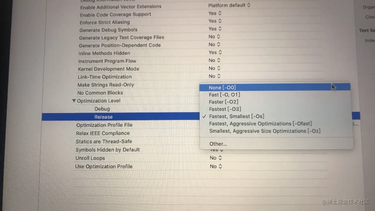在Xcode项目中,可以通过Apple Clang - Code generation的Optimization Level来对debug或release下的代码进行优化。