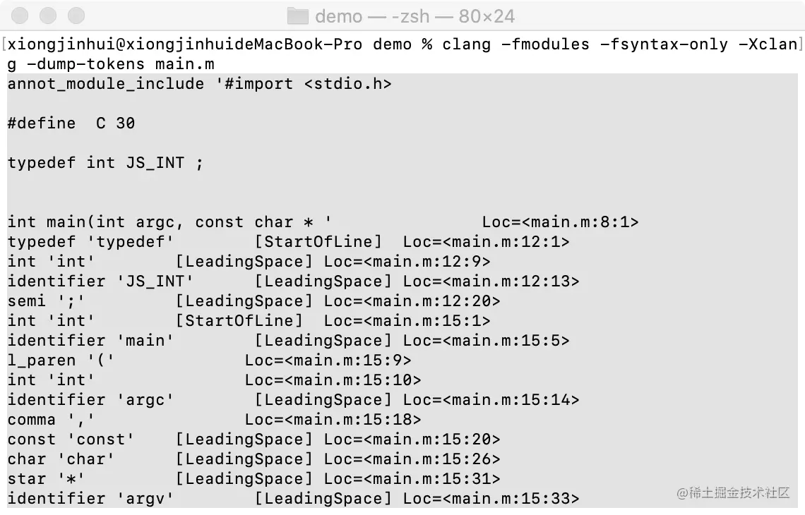 clang -fmodules -fsyntax-only -Xclang -dump-tokens main.m