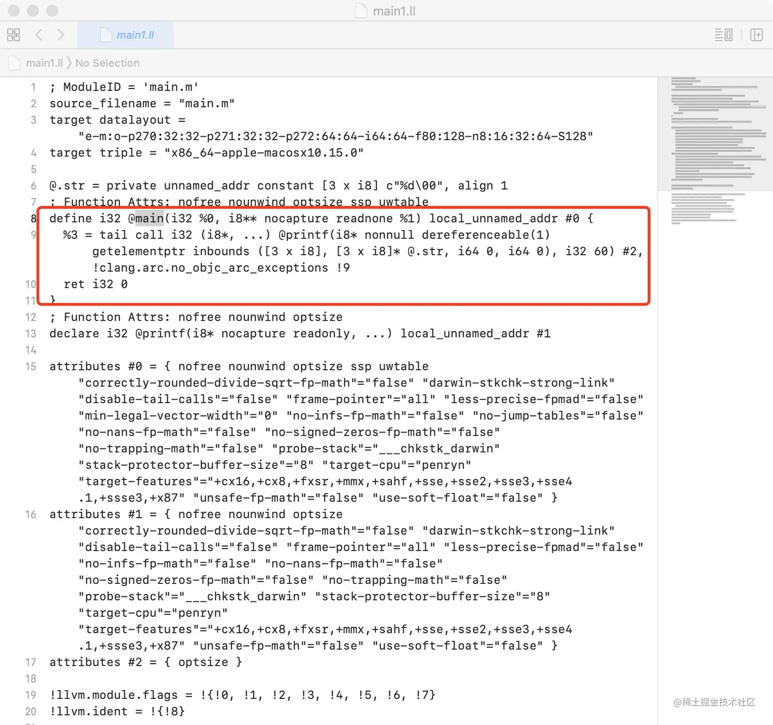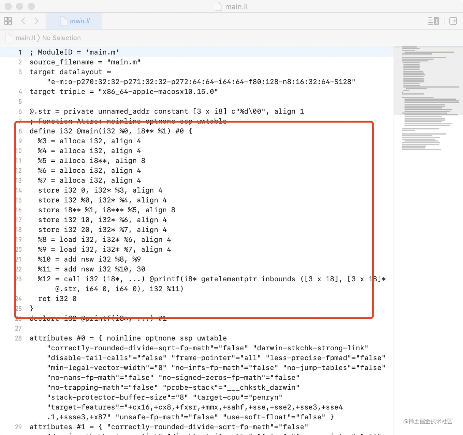 使用Xcode打开main.ll文件(也可以用sublime Text打开)