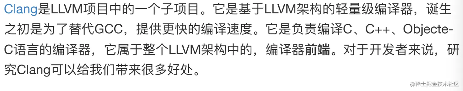 LLVM就是苹果开发的一套将前后端分离的编绎器,Clang就是LLVM的一个子项目,以及知道了平常我们写的代码是通过预编绎-> 编绎(词法分析和语法分析)->中间代码生成和优化-> 生成汇编代码-> 生成目标文件-> 生成可执行文件,这一系列操作,最后得到了机器可以识别的mach-o文件.