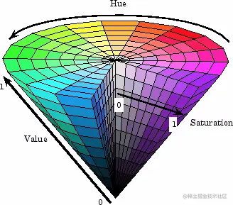 HSV(Hue, Saturation, Value)是根据颜色的直观特性由A. R. Smith在1978年创建的一种颜色空间, 也称六角锥体模型(Hexcone Model)。 这个模型中颜色的参数分别是:色调(H),饱和度(S),明度(V)。