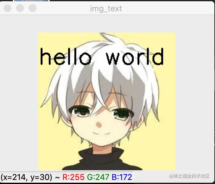 res_img = cv2.putText(img, 'hello world', (0, 50), font, 1.2, (0, 0, 0), 2)
