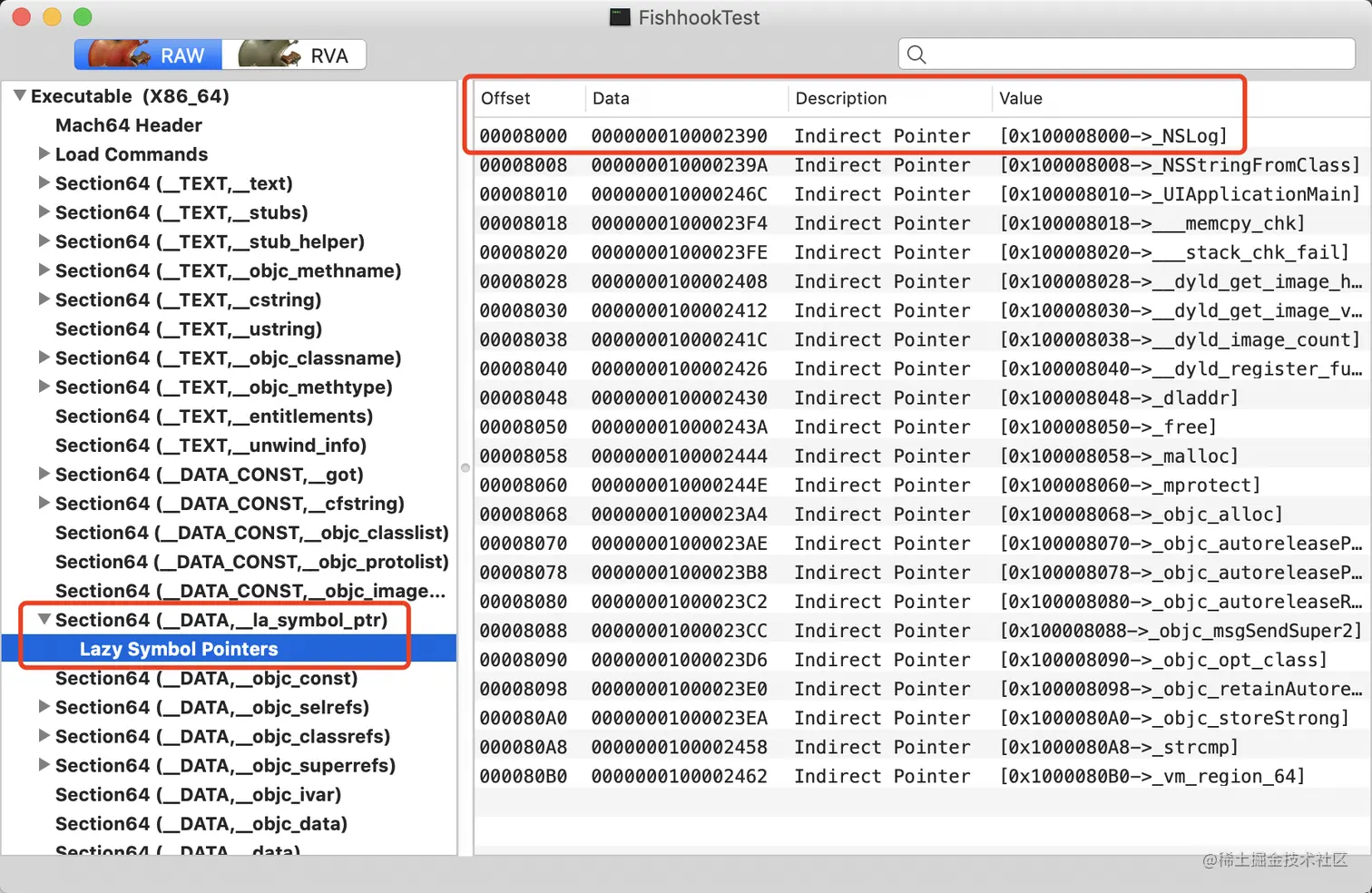 在上述原理中讲到fishhook是通过重绑定懒加载符号表的符号地址的方式来实现hook系统库函数的,下面来验证一下: