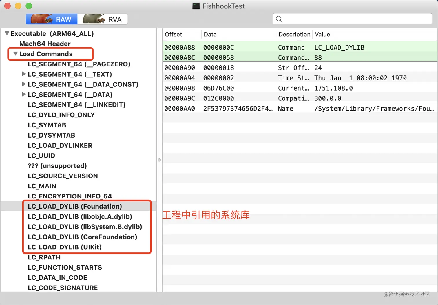 - App在编译阶段、链接阶段 都做了什么? 阅读过Mach-O文件结构的读者应该了解,在编译阶段,在工程中使用到的系统库是不会编译进Mach-O中的(这会增大Mach-O的体积),仅仅将依赖的系统库记录在Load Commands段中的LC_LOAD_DYLIB,如图: