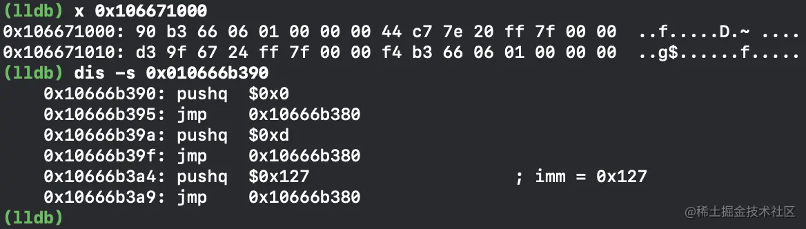 查看该内存地址0x106671000的内容,并查看其汇编代码