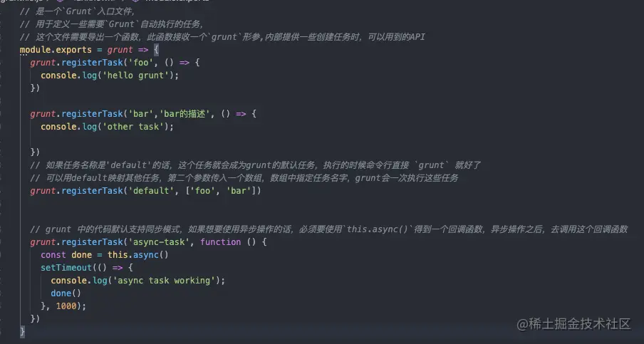 gruntfile.js是一个Grunt入口文件,用于定义一些需要Grunt自动执行的任务,这个文件需要导出一个函数,此函数接收一个grunt形参,内部提供一些创建任务时,可以用到的API