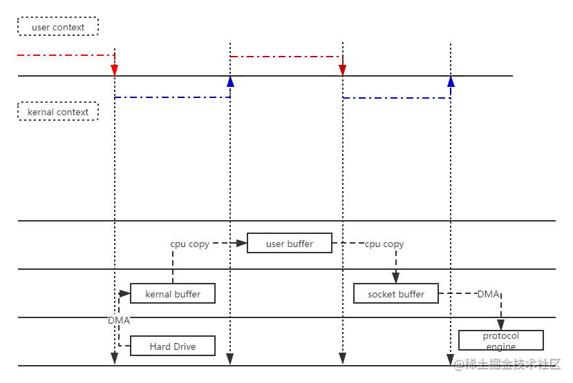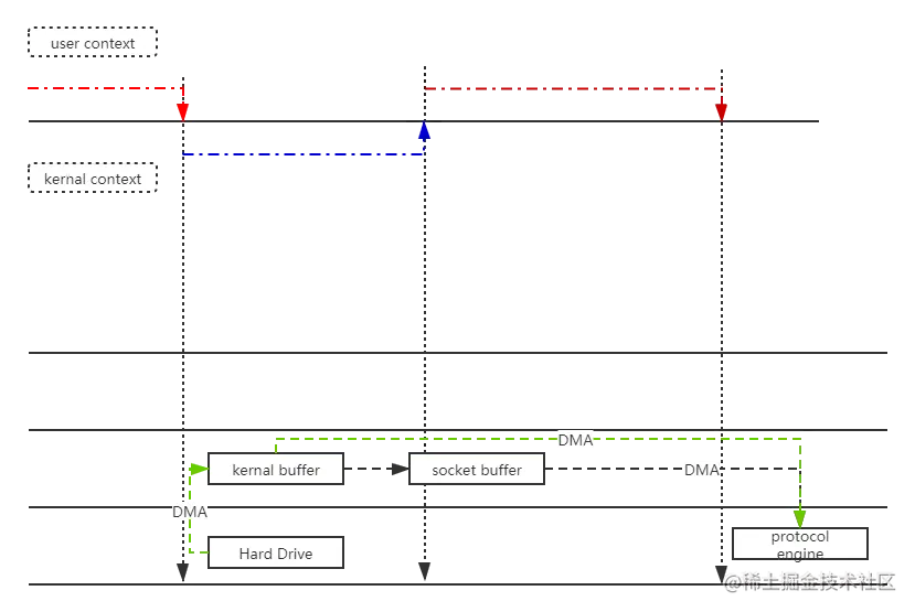 - 数据最终经过socket通过DMA传动到硬件缓冲区,write系统调用返回,从内核态切换成用户态
