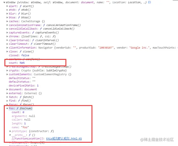 【打印出window对象】:发现foo上确实有count属性。但是在window全局变量上面也有一个count.