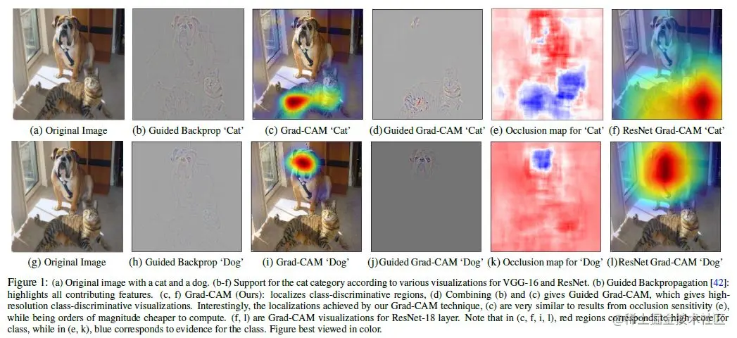 虽然Grad-CAM的可视化是具有类别判别力的,并且能够定位到相关的区域,但是它缺少显示细粒度重要性的能力。例如图1(c),虽然Grad-CAM可以定位到猫的区域,但是为什么网络将它预测为“tiger cat”,从低分辨率的heat-map很难得到结论。为了能够定位的同时也显示细粒度,作者通过点乘将Guided Backpropagation 和Grad-CAM相结合,得到Guided Grad-CAM。如图1(d,j)所示。
