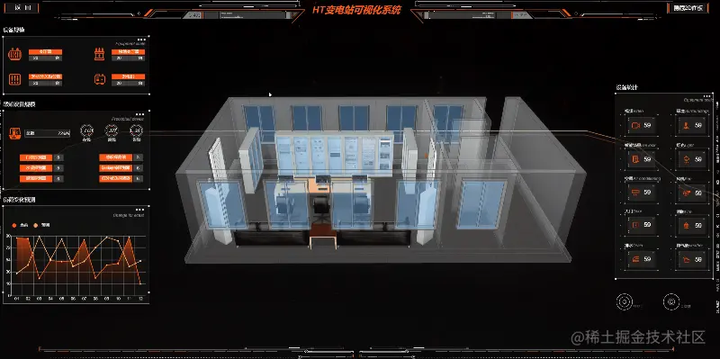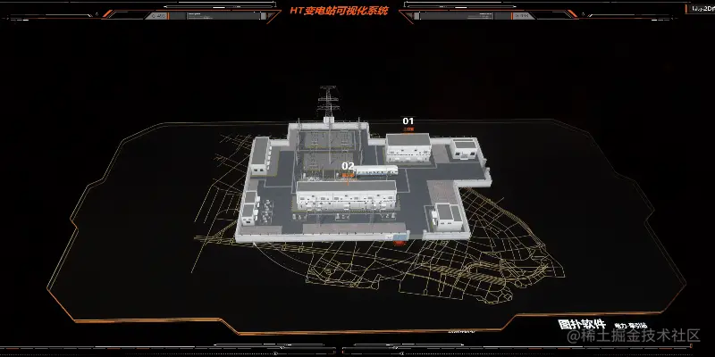 HT for Web 自主研发了强大的基于 HTML5 的 2D、3D 渲染引擎,为可视化提供了丰富的展示效果。在 2D 组态 和 3D 组态 上,Hightopo(以下简称 HT )的 HT for Web 产品有着丰富的图标图源可供选择,囊括了各行各业,本文将以电力牵引站为例,介绍运用 HT 丰富的 2/3D 组态 进行3D可视化数字孪生,建立动态的数字化变电站动态模型,搭建出一个变电站可视化系统。