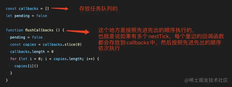 上边的截图我们可以看到还有个方法flushCallbacks, 这个方法的作用是什么呢,这个方法的作用其实就是利用了先进先出的思想去执行队列里边的任务,因为如果有多个nextTick在实例中出现,vue会默认先执行先进入队列里边的任务