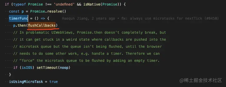 上边的截图我们看到了nextTick传进来的第一个参数也就是我们的执行方法,会被放到callbacks数组中,也就是vue内部自己实现的一个执行的队列,咱们接着往下看