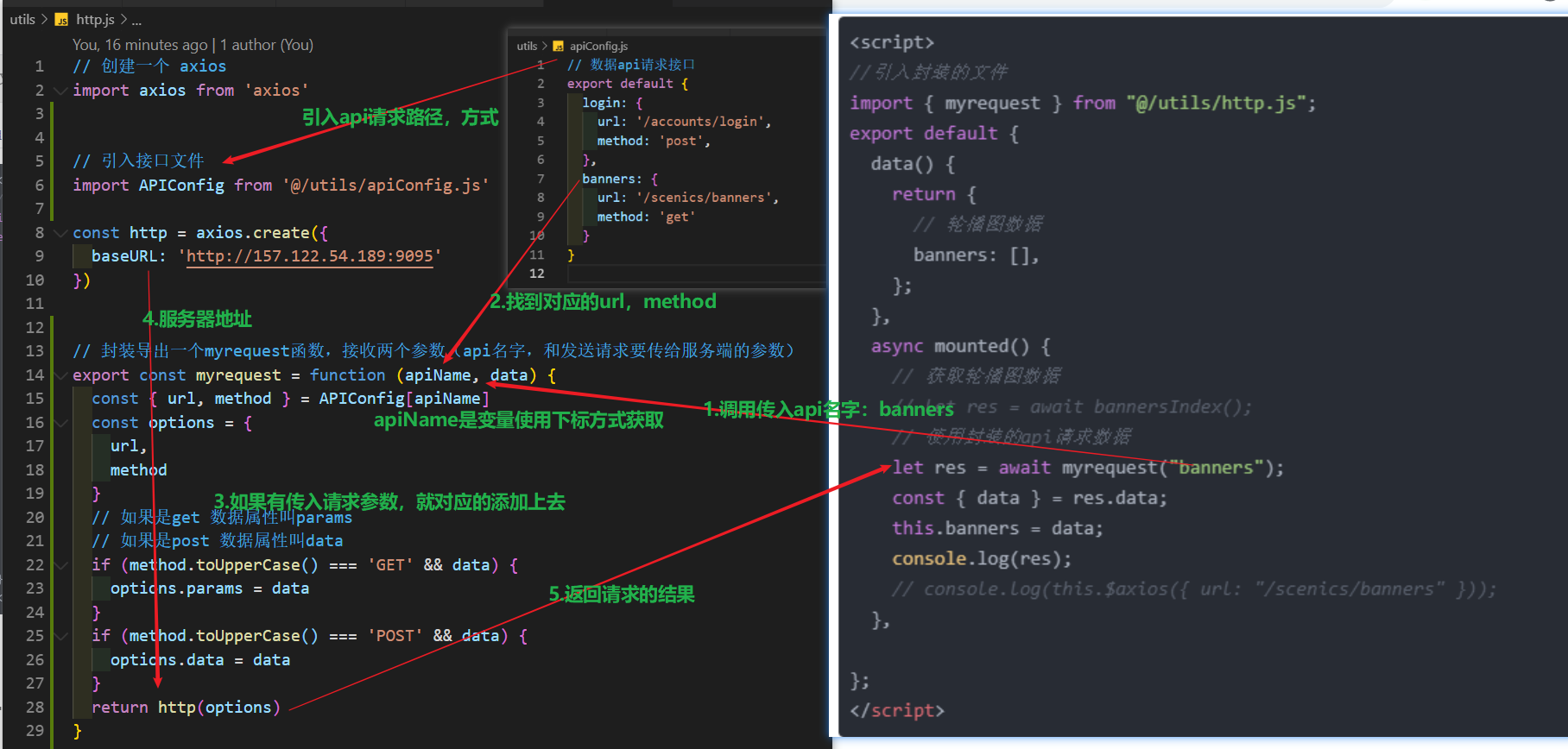 // 创建一个 axiosimport axios from 'axios' // 引入接口文件import APIConfig from '@/utils/apiConfig.js' const http = axios.create({ baseURL: 'http://157.122.54.189:9095'}) // 封装导出一个myrequest函数,接收两个参数(api名字,和发送请求要传给服务端的参数)export const myrequest = function (apiName, data) {//apiName是一个变量,所以要用下标方式获取 const { url, method } = APIConfig[apiName] const options = { url, method } // 如果是get 数据属性叫params // 如果是post 数据属性叫data if (method.toUpperCase() === 'GET' && data) { options.params = data } if (method.toUpperCase() === 'POST' && data) { options.data = data } return http(options)}// 暴露export default http