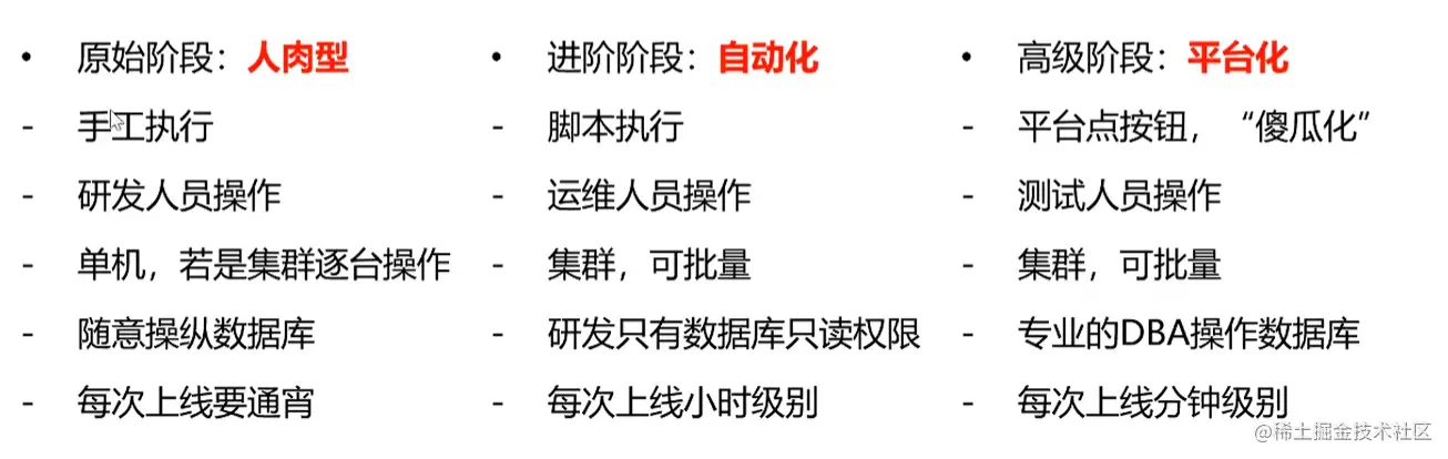 3.实现步骤要一步步来,人肉->自动化->平台化,不是一蹴而就的,要对应公司目前的发展一步步来,找到最适合自己公司业务发展的方式。