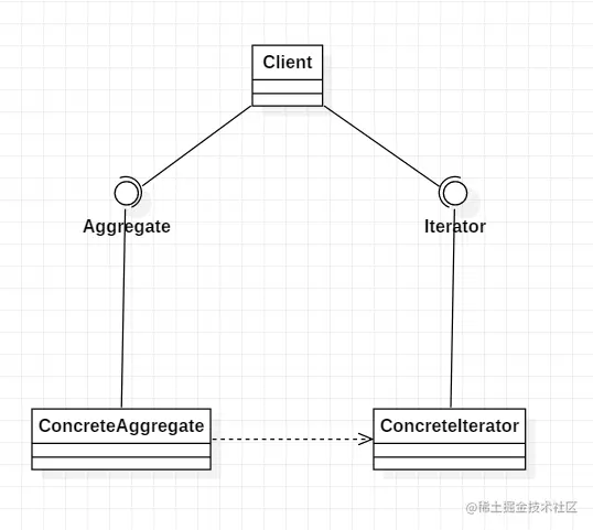2、客户端遍历集合时只需要获取一个迭代器即可完成遍历,无需知道聚合类的内部结构。